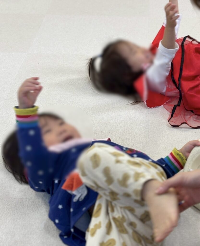 抱っこでゆらゆらしたり、手をつないでとことこ歩いたり、音楽に合わせて楽しく体を動かす50分。